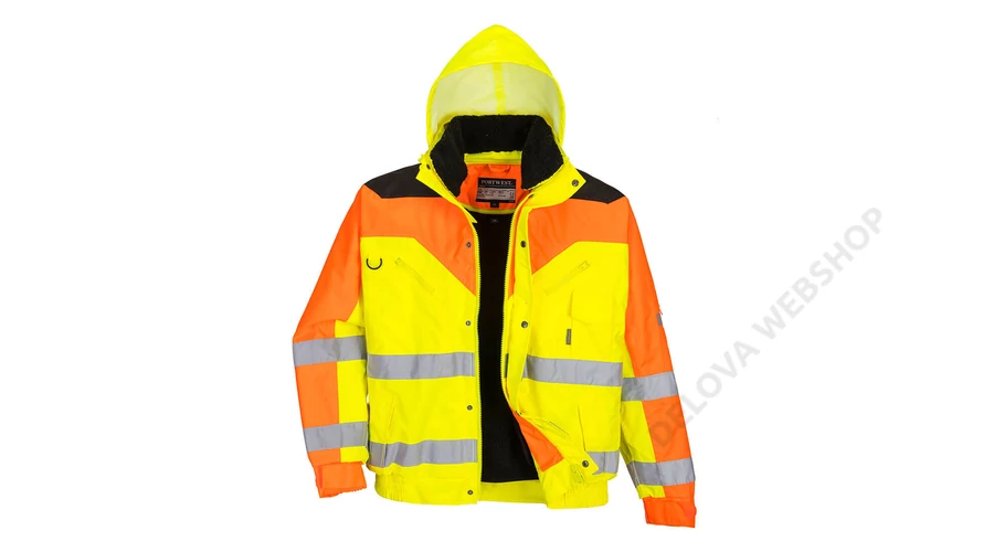 Legyen látható minden körülmények között a Hi-Vis bomberdzsekik ezen innovatív koncepciójával. Ez a ruhadarab zippzáras szőrmebéléssel, levehető szőrmés gallérral, rejtett kapucnival, biztonsági zsebbel és zippzáras előlappal rendelkezik. Minden varrás szalaggal van lezárva