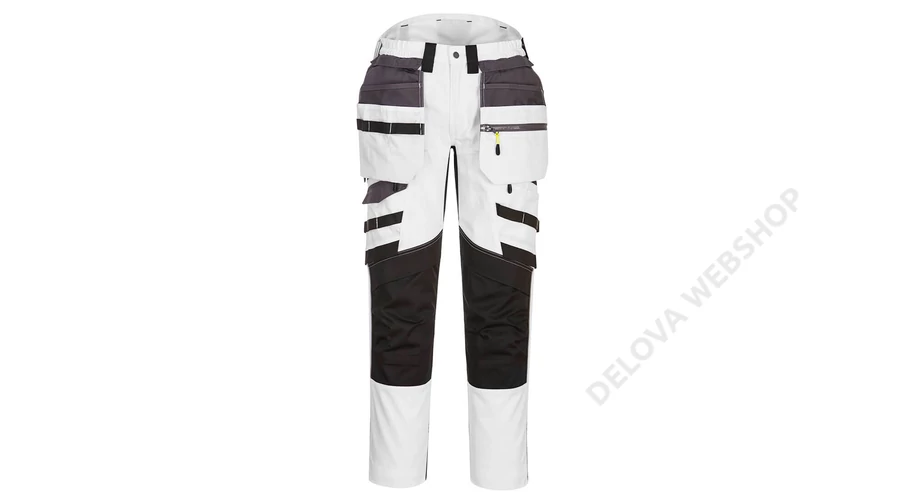 A DX4 lengőzsebes nadrág okosan megtervezett, a dinamikus 4X stretch anyag célzott elhelyezésével biztosítja a maximális mozgástartományt munka közben. Ezek a lengőzsebes nadrágok magasan emelkedő hátsó derékpánttal rendelkeznek, oldalt elasztikusak, ezzel biztosítva a védelmet minden pozícióban. Az előre hajlított, felülről tölthető, állítható térdpárnazsebek, a nagyméretű elülső zsebek és a többfunkciós zippzáras combzsebek biztonságos tárolást biztosítanak a telefon, a tollak és a szerszámok számára. Háromszoros varrás a maximális tartósság érdekében.